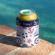A colourful nautical pattern is the feature on this personalised can cooler. Images include an anchor, a ship's wheel, a life buoy, a sailboat and a pennant. The images are in red and blue, and placed on a white background. At the top is a solid navy section bordered in red. The top section has your name in white between two white anchors.
