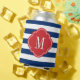 Cute trendy monogrammed can or bottle cooler with a patriotic red white and blue stripe pattern. Personalise it with a custom monogram or other text in a chic quatrefoil frame. Click Customise It to change text and fonts to create a unique one of a kind gift or favours for your 4th of July BBQ party!