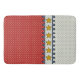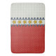 The original design on this cushy bath mat conjures up the cheerful, cosy, home-front look of the late 1930's through the 1940's. Asymmetrical block of Oyster White pin-dots on Cherry Red on the left and Navy Blue pin-dots on Oyster White on the right are set apart with a column of 5-pointed mustard colour stars bordered w/ vertical strips of medium blue rick-rack. See coordinating products exclusively at HoMeArts.