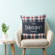 Modern red white and blue tartan throw pillow featuring customisable family name to complement your farmhouse decor. The deep red and blue colours will make any corner cosy and warm.