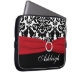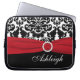 This personalised black and white damask laptop sleeve with a red FAUX ribbon and jewel brooch has a text box for you to customise with your own name, monograms, business name, or other text. If you need any help customising it the way you want, please email niteowlstudio@gmail.com for help.