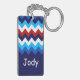 A monogrammed acrylic rectangular keychain featuring a colourful, trendy pattern design of red, white, and blue chevrons. Create the perfect customised gift by clicking the “personalised” button to add a name or custom message in the provided template field. Select the “click to customise further” link to change the font, text size and more.