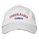 White cotton ball cap, with red embroidered text reading CHEERLEADER, in a slight arch shape. Additional blue embroidered text, under Cheerleader text, is ready to personalise. Great for cheerleaders and cheer coaches.