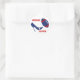 Fun football themed invitation envelope seal stickers. Done in a round shape, with a white background and graphics of a red and blue football being kicked with a elegant blue stiletto high heel shoe. Red text reads Wedding Shower. Personalise the text for your event.