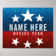 Red white and blue American flag colors sparkle delightfully. Stars and stripes pattern features a faux glitter effect. Name and political office template is bold, easy to read, and customizable. Perfect for political campaigns during elections.