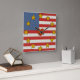 Fun wall clock features Leslie Sigal Javorek's delightfully original patriotic design based on the American Flag: w/ alternating polka-dotted stripes of red and white; a polka-dotted blue block in the left-top corner; spicy mustard color stars as hour markers, and a shaggy red heart in the center. Choose square or round style.
