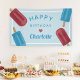 Designed to match our popsicle kids' birthday party invitations, this cute personalised banner features red and blue popsicles with the words "Happy Birthday [Name]" in the centre in retro lettering, adorned with a heart.