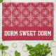 Our custom kitchen towel adorned with red and white pattern and text in school type lettering. View our full line of products in our Zazzle store.