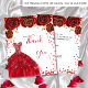 A feminine and elegant birthday thank you card. A white background, with red faux glitter, sparkles, red roses and a red dress. On front a large hand lettered script and the text: Thank You.