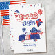 Red White and Due pregnancy announcement. The design features a vintage truck with doughnut wheels and american flag loaded with a huge cupcake, along with kites and balloons decorated with stars and stripes. This fourth of july themed invite has a red white and blue colour scheme with groovy retro typography. Modern gender neutral design if you don't know, or don't want to let on, if you're expecting a baby boy or girl.
