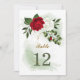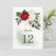 romantic red and white flowers with some green leaves and gold glitter table number card