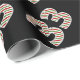 This simple, fun wrapping paper design features the number "33" having a Christmas themed red, white, and green stripes pattern, on a black coloured background. Wrapping paper like this might be used when wrapping presents or gifts being given to celebrate some thirty third event that also happens to fall on December 25th (Christmas Day), such as somebody’s 33rd birthday or a couple’s 33rd wedding anniversary. [~Z0000408]