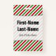 This badge design features a pattern of red, white and green stripes. These are colours commonly associated with Christmas. It also features a personalised name in black coloured text within a light coloured area. There is also a customisable message under the name that could show information such as a job title, or a profession, or a business/company name. [~Z0000176]