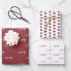 A gift wrap set features 3 different papers: red hearts on white background, red distressed text "love" on white background, and white text "love" on a red background. This elegant Valentine wrapping paper is a beautiful way to send love to friends and family on Valentine's Day.
