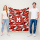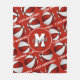 This team colours fleece blanket features stylised basketballs that have alternating red and white recolored panels - athlete name and monogram can be personalised on the large circle pendant that overlies a mirrored pattern of small basketballs and the sporty font text "I love basketball" in white stretching between the angled rows of basketballs - background is customisable red - easily delete the "I love basketball" text lines, if desired, or replace the monogram with the player's varsity letter or jersey number - by katz_d_zynes
