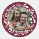 Modern and minimal Christmas photo sticker featuring a white wreath with holly berries and evergreen branches framing a placeholder for your photo on a red background. Personalise by changing the colour of the background or wreath to match your style or leave as is.