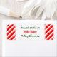 Custom baking labels with red vintage and script letters on a sweet holiday pattern of red and white peppermint candy stripes on a smaller return address label.