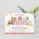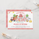 Cute girl's farm first birthday invitation featuring some cute barnyard animals, red tractor, red barn bunting flags and more. Great for a red farm themed first birthday party.