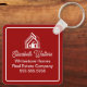 This professional realtor keychain is custom made with your real estate company name under the modern cursive script and house image. This bright red and white realty business promotional items feature a house logo image for home builder or realty agent company marketing.
