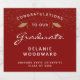 Celebrate your graduate's milestone in style with these custom graduation sparkling wine bottle labels, featuring the words "Congratulations to our Graduate" in white text on a red background. The word "Graduate" appears in a graceful handwriting-style script. A pair of gold faux glitter mortar board caps and a scattering of gold confetti decorate the top portion of the label. Personalise it with your grad's name, school, and year of graduation.