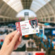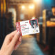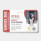 Horizontal service dog ID badge in red and white with room for a photo of the service dog and two logos. Add name, title, and registration number. Add the handler's name and contact information too.