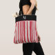 Here's a stunning red, and white irregular stripe pattern that makes a great looking tote bag! A wide top border of black holds your simple one letter monogram in white. The black border is separated from the stripe section by thin red and white lines. Both sides of the bag have the same design. Bold and unique, with a personalised touch!