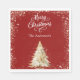 A red background and white text. Decorated with a snowcovered pine tree with golden faux glitter as snow. Merry Christmas is written with an elegant hand-lettered style script. Personalize and add your family name