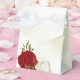 Beautiful wedding favour box featuring red and white flowers and green leaves