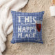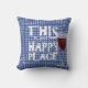 Glass of red wine with happy quote on white and blue gingham checked background.