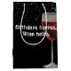 Glass of red wine in stemware with birthday confetti and fun quote on black background.