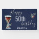 Red Wine Rose Watercolor Navy Blue 50th Birthday Party Banner. The design has watercolor red wine glass, roses and twigs on a navy blue background. The text is in white and is fully customisable - personalise it with your name and any age. Great as a woman or man's birthday party backdrop.