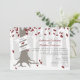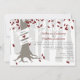 A winter wedding invitation featuring an illustration of a tree in the forest. Tree has red, silver, and white leaves, exposed roots, and a trunk wrapped with banner that can be customised with bride & groom's names. Ground and background trees are white. Wording is from bride and groom.