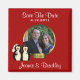 Cute custom Save the Date wedding Magnet, done with a red background, with a gold edged round photo field. A sweet country artwork penguin bride and groom decorate the bottom. Personalise this pretty magnet as a great way to announce your wedding plans.