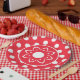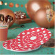 A Red With White Polka Dotted Paper Plate With Boho Flower Center For Any Type Of Party