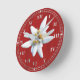 Pretty round wall clock, with graphics of a single Alpine flower bloom of an Edelweiss, on a red wooden looking background. Silver tone Roman numerals decorate around the outside edge of the clock. Customise to add any text you want.
