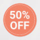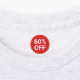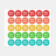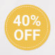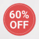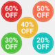 Round 60% off sales stickers in yellow, orange, red, green, and turquoise with customisable text so you can personalise the sale.