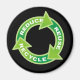 Green enviromental symbol, circle with arrows and the words reduce, reuse, recycle. Custom background colour.