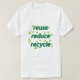 This recycled, reused, and reduced graphic is a perfect way to spread the message of recycling while showing off your sense of style what better way to get the message out than by wearing it on your chest? which means you're doing your part to help save the planet This design is the perfect gift for the eco-friendly family member or best friend. This unique artwork also fits in time for World Environment Day on April 22 and the International Planet Day event celebrated worldwide to pledge support for environmental protection. If you like this artwork, check out similar designs in the Omitay store.