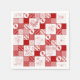 Redwork Stitched Flowers Quilt-PAPER PARTY NAPKINS-An allover digitally stitched quilt pattern. The colours are red and white. Assorted red and white designed squares fill in between the larger stitched squares. The larger squares are solid white, trimmed with digital red stitching with a stitched flower in the centre. It’s a beautiful botanical floral quilt for quilt lovers. This might be a nice design for outdoor summer gatherings and even just for everyday use. Coordinating Zazzle party supplies is available.