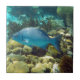 Swimming above soft corals, the scales of a blue reef fish pick up a few glints of the sun, as the light filters down from above the water's surface, while other smaller fish swim in the background.