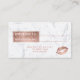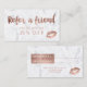 Refer a friend with this modern, stylish makeup referral card with modern hand lettering style brush typography in faux rose gold foil on a trendy and elegant white marble background with lips.