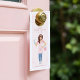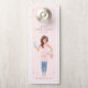 Modern and professional house cleaning referral door hanger designs featuring a beautiful, smiling, and friendly woman with one hand on her hip, holding a bucket of soapy water, and the other hand holding a cleaning spray bottle. The lady is dressed in a cute blush pink striped apron, a blush pink shirt, and denim jeans. The reverse side is designed in a clean and minimal style with some of the cleaning supplies added. Personalised with your referral details, website, and social handle. A simple, chic, and stylish door hanger for maid services house cleaners, and much more. All artwork aoriginal artwork by Moodthology Papery.