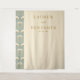 This elegant wedding backdrop features a sophisticated floral pattern in soft pastel tones, creating an inviting and romantic atmosphere. The design combines delicate white flowers with muted teal accents on one side, while the other side offers a clean, neutral canvas for text or additional decorations. The typography is classic and refined, enhancing the timeless charm of the overall look. Perfect for a serene and stylish celebration, this backdrop sets the perfect scene for capturing memorable moments at your special event.