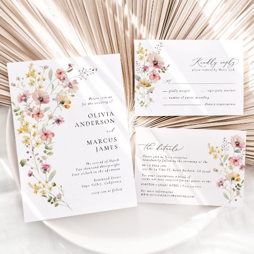 This refined boho meadow wildflower wedding invitation features an editorial-style, name-centered layout designed to balance elegant typography with soft meadow-inspired floral artwork. The composition emphasizes generous white space and intentional placement, allowing both the couple’s names and the watercolor wildflowers to feel elevated rather than decorative.