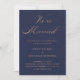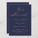 This elegant, stylish post-wedding brunch invitation features lots of modern, swirly faux rose gold calligraphy on a deep midnight blue background.