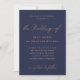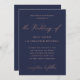 This elegant, stylish wedding invitation features lots of modern, swirly faux rose gold look calligraphy on a deep, midnight blue background.
