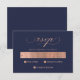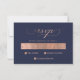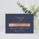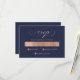 This elegant, stylish wedding response card features modern, swirly faux rose gold calligraphy on a deep, midnight blue background.