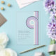 Retro 70's geometric lines have been given a facelift with a transparent background and contemporary colour scheme, to create the pieces of this eye-catching wedding design set. The colour palette ranges from soft lavender through shades of deep violet and steel blue to give this set a very trendy vibe. The arcylic wedding invitation shown here features all of the above plus a template to easily add your own pertinent event information. Search ID983 to see all the coordinating pieces in this set.