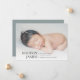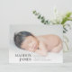 Modern minimal birth announcement card features a horizontal or landscape orientated photo with baby's name, birth stats, and a family signature aligned at the bottom in elegant, classic lettering. Add three additional square photos to the back.