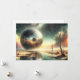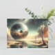 This weathered, surreal metallic sphere reflects an apocalyptic, baron desert landscape, with dead trees, fire and smoke.